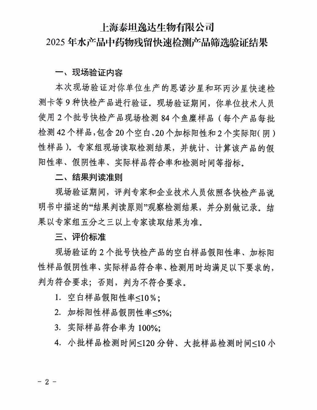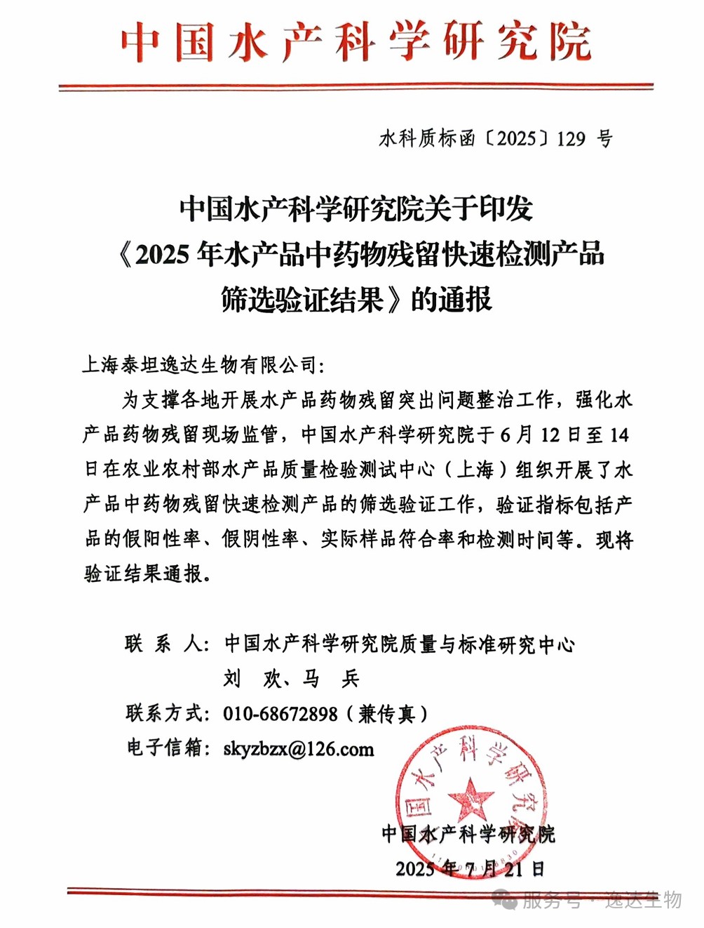自2024年8月成立以来,在泰坦科技平台的强力助推下,上海泰坦逸达生物有限公司(简称 Yetta Bio)在食品安全快速检测领域佳绩频传。今年,公司不仅陆续通过了国家粮食科学研究院针对真菌毒素的荧光免疫层析试剂卡验证,以及农业农村部国家饲料质量检验检测中心(北京)2025 年度针对 “瘦肉精” 免疫速测产品评价,如今更是在水产快速检测领域传来喜讯!